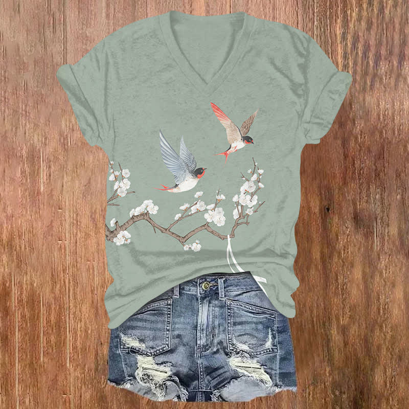 Japanese Vintage Sakura & Swallow Art Print V-neck T-shirt