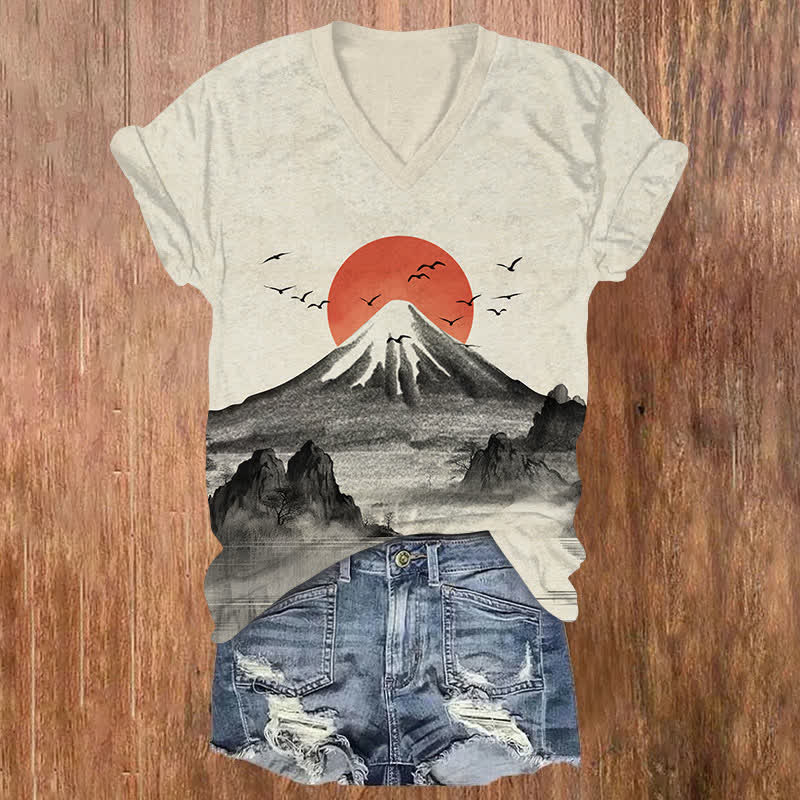 Japanese Vintage Ink Watercolor Mount Fuji Print V-neck T-shirt