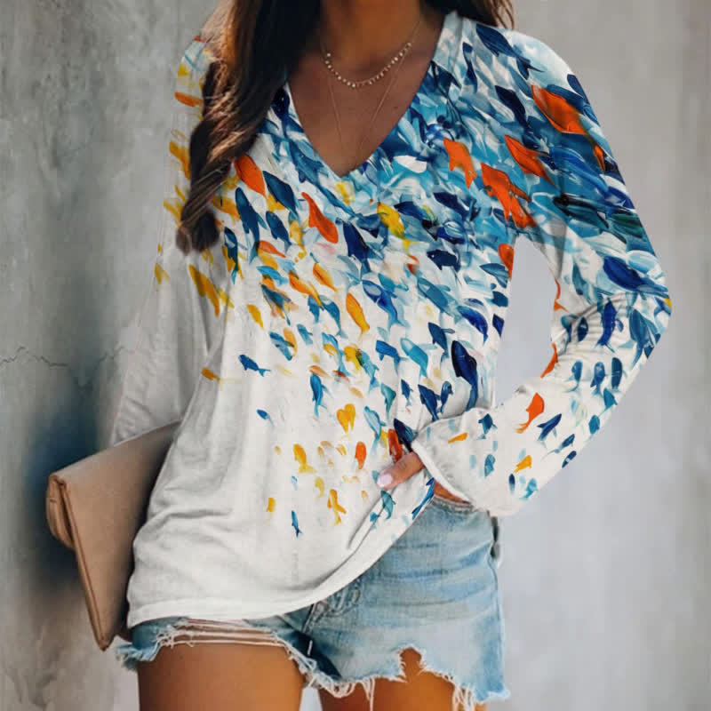 Vintage Abstract Watercolor Fish School Art Print Long Sleeve T-shirt
