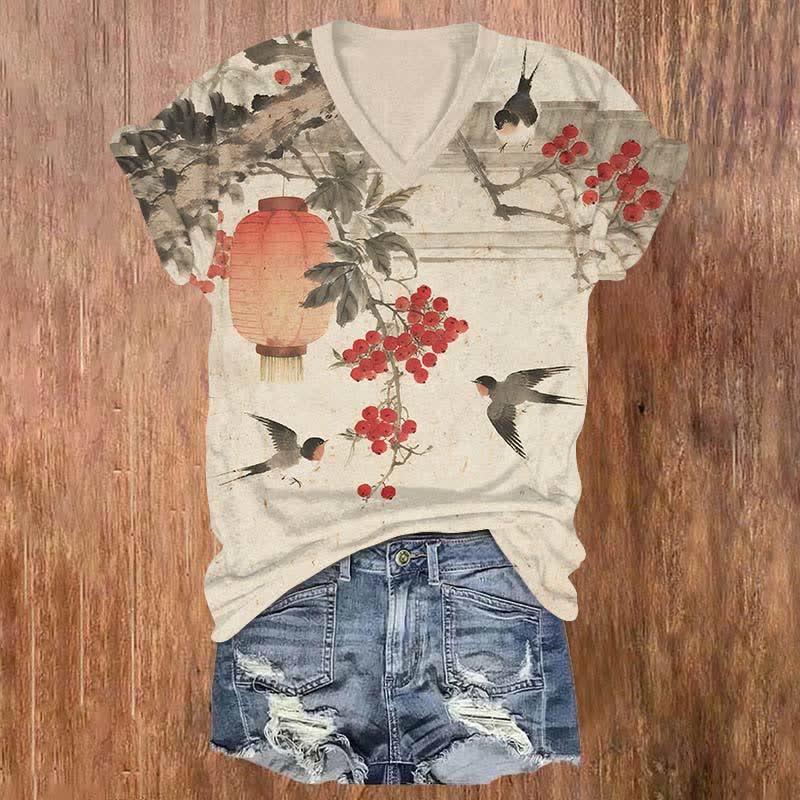 Japanese Vintage Watercolor Swallow & Lantern Print V-neck T-shirt