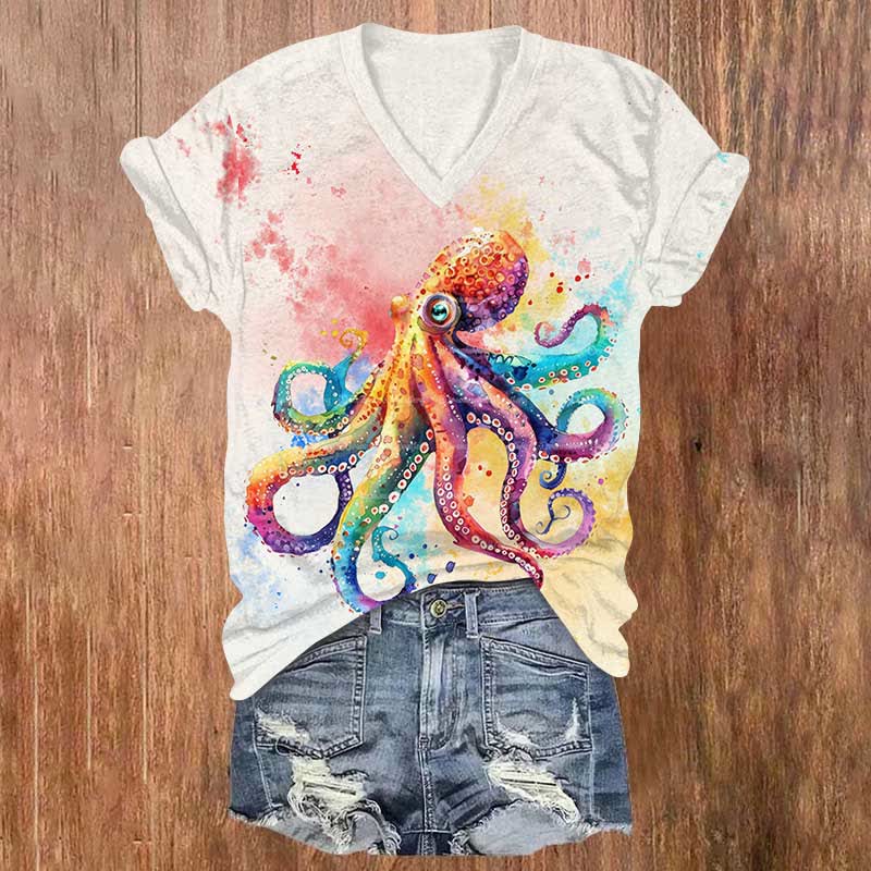 Vintage Colorful Splashing Ink Octopus Art Print V-neck T-shirt
