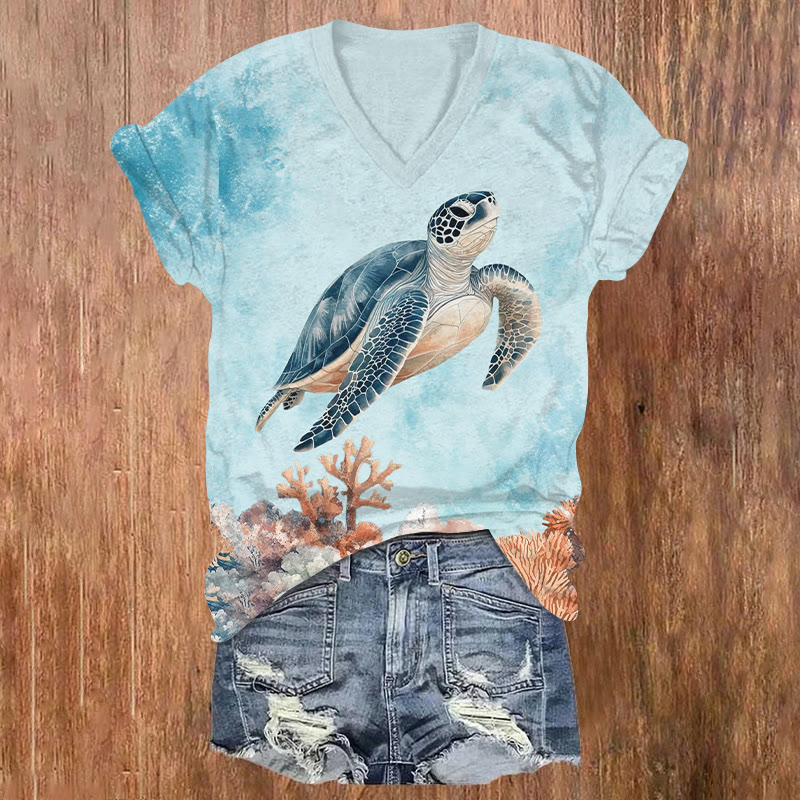 Watercolor Sea Turtle & Coral Art Print V-neck T-shirt