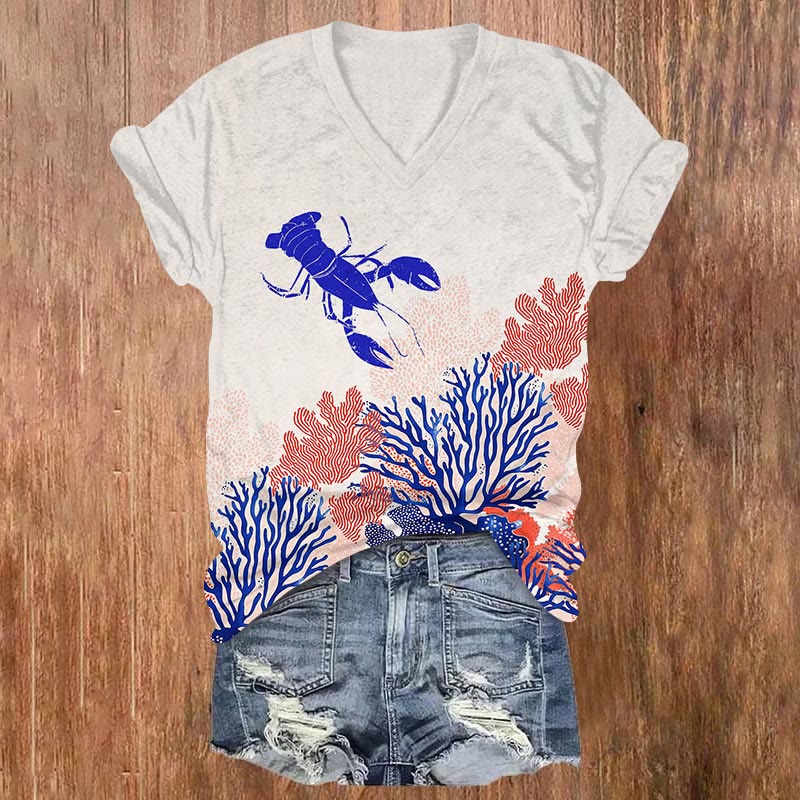 Lovely Crab & Sea Weed Print V-neck T-shirt