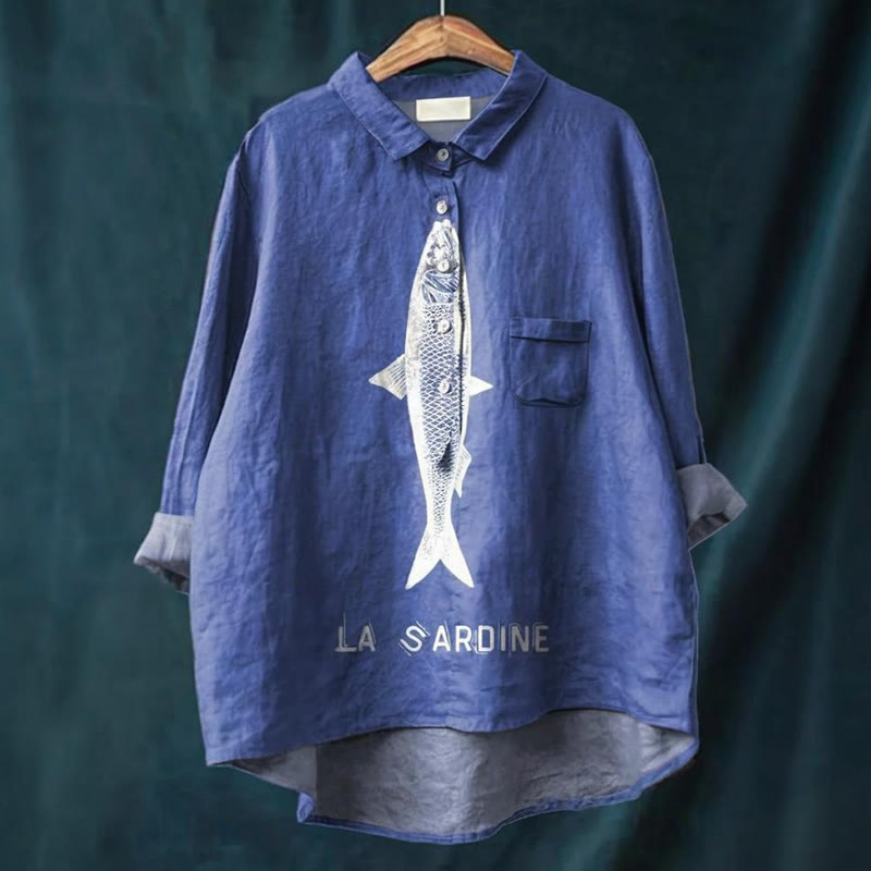 Sardine Fish Graphic Printed Women's Casual Cotton And Linen Shirt