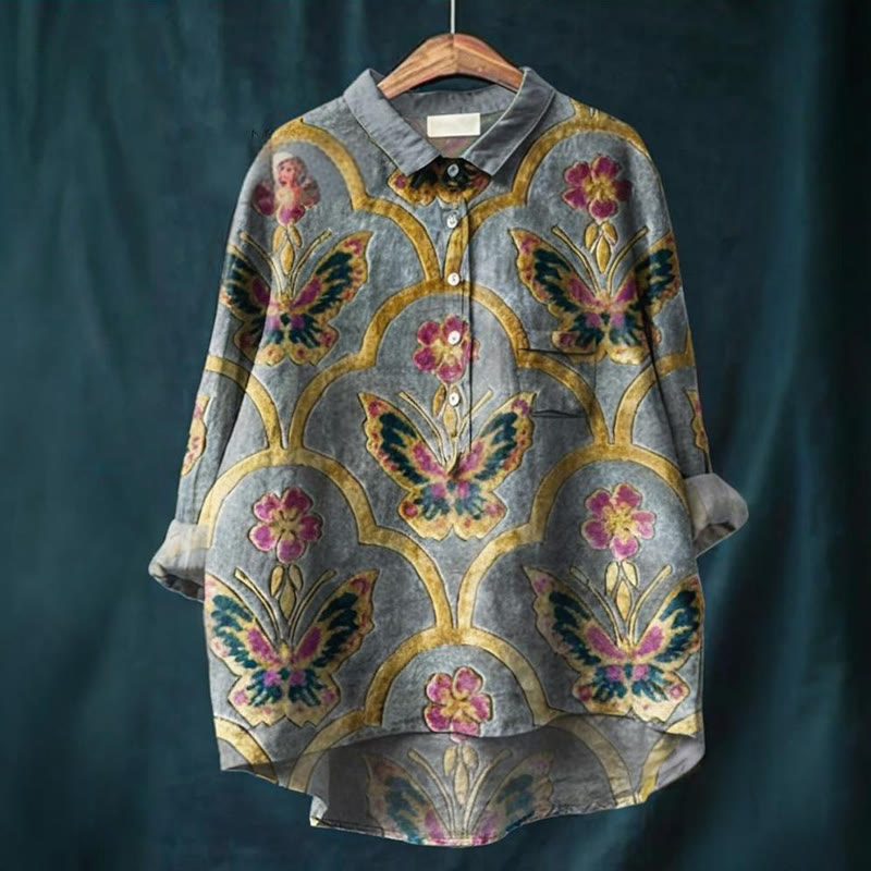 Vintage Lovely Butterflies Art Print Casual Cotton And Linen Shirt
