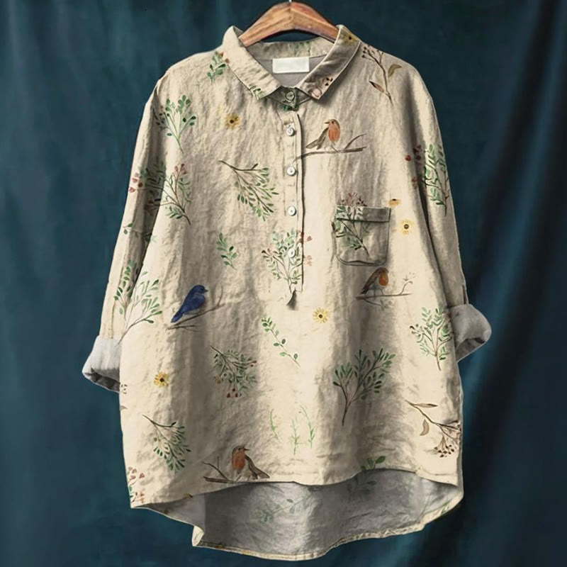 Women's Vintage Floral Animals Art Print Casual Cotton And Linen Shirt