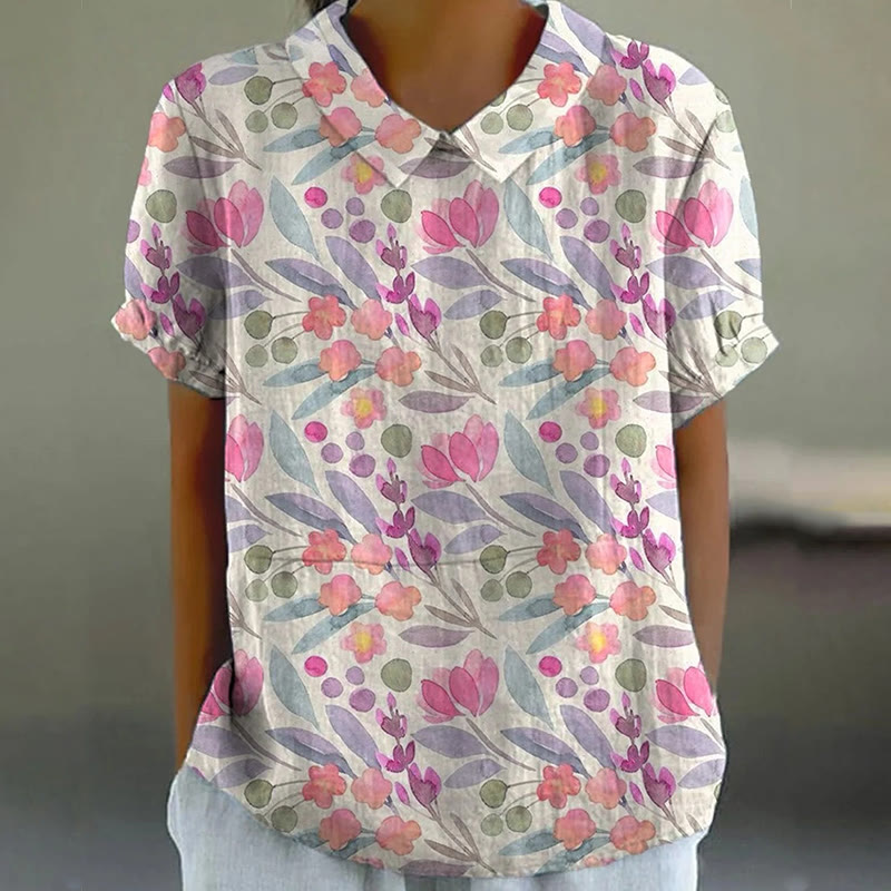 Watercolor Spring Garden Floral Repeat Pattern Printed Women's Casual Cotton And Linen Shirt