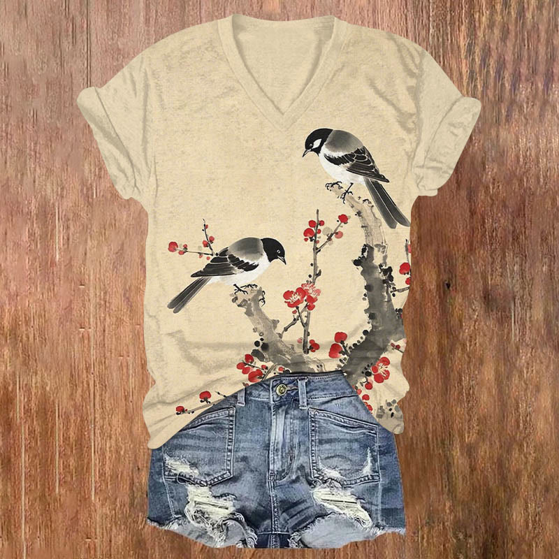 Vintage Ink Watercolor Birds On Branch Art Print V-neck T-shirt