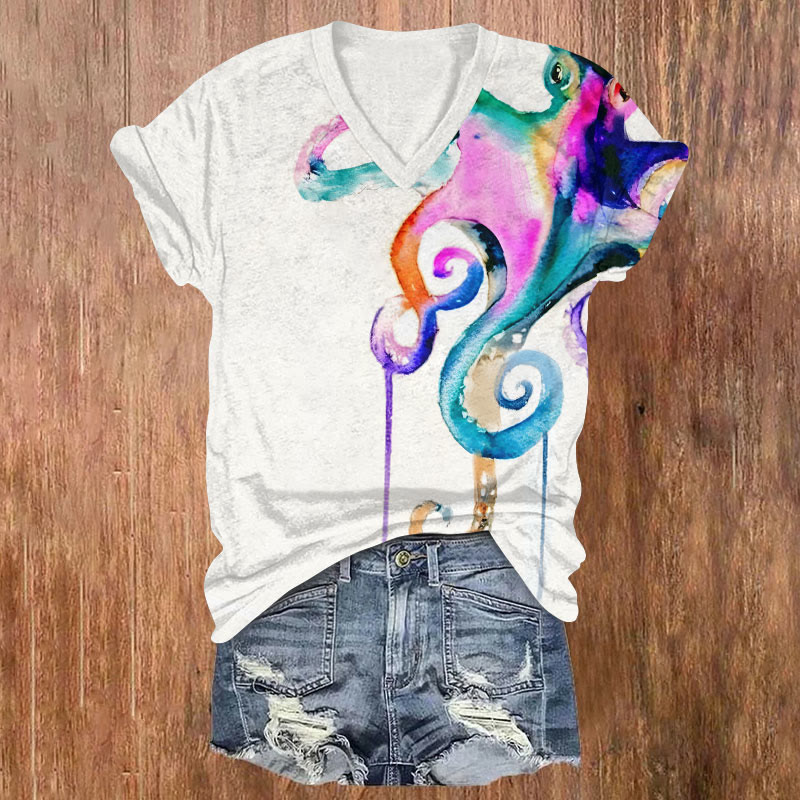Creative Rainbow Cat Print V-neck Short Sleeve T-shirt