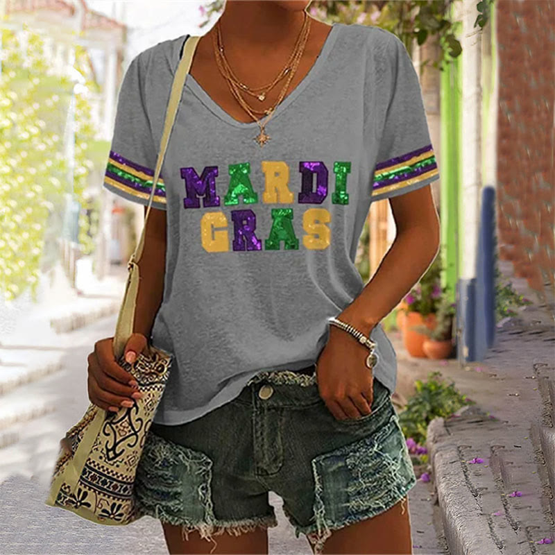 Mardi Gras Purple Green And Gold Print Casual V-neck T-shirt