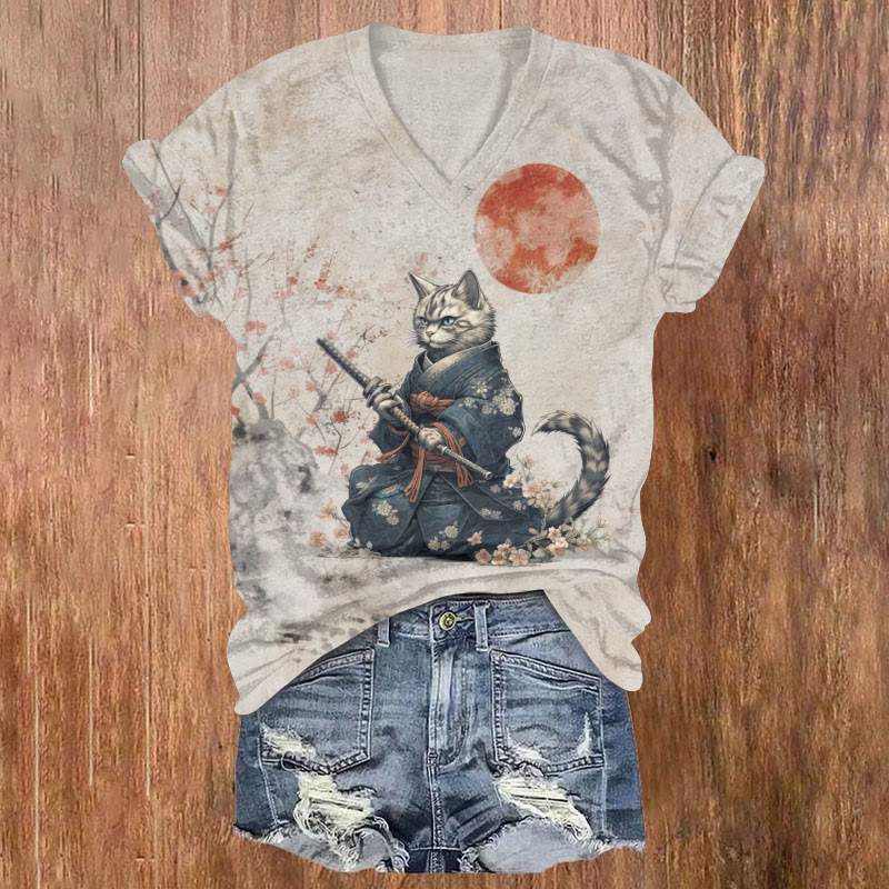 Japanese Retro Kimono Samurai Cat Print T-shirt