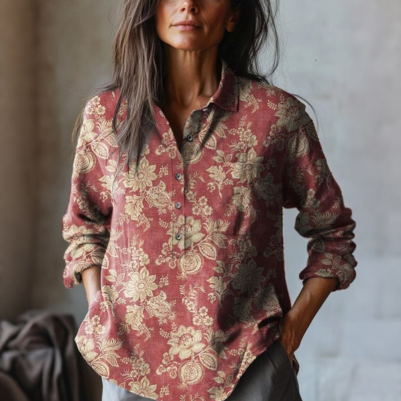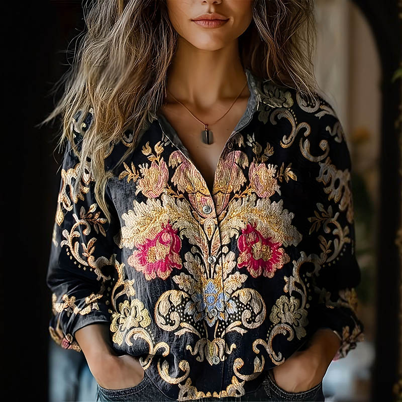 Vintage Ethnic Floral Lapel Long Sleeve Shirt
