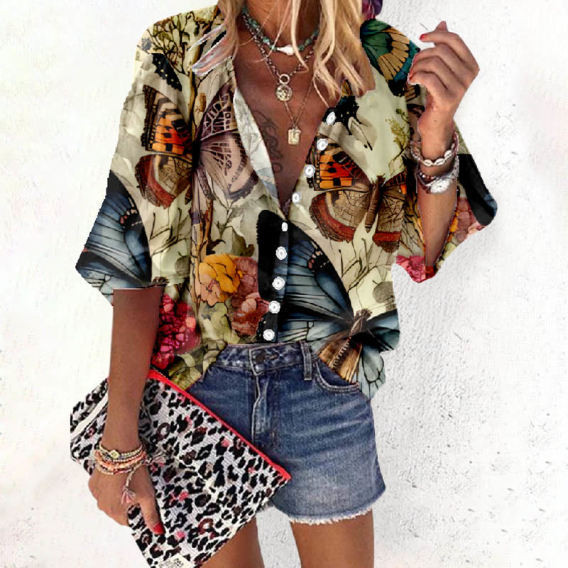 Women's Colorful Butterfly Collecting Nectar Print Casual 3/4 Sleeve Blouse