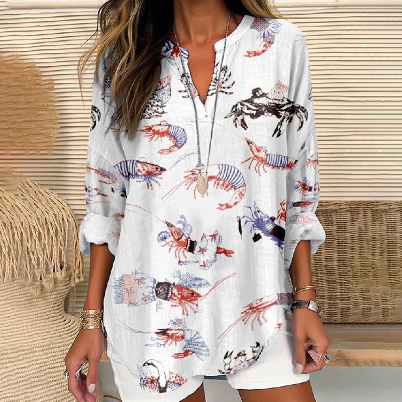 Women's Funny Watercolor Lobster And Crab Printed V Neck Long Sleeve Blouse