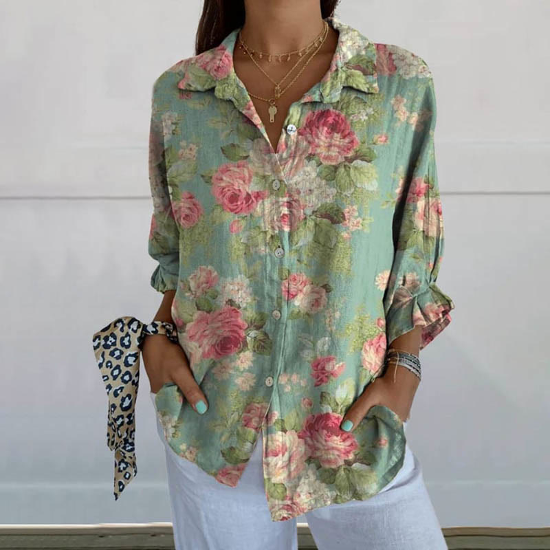 Women's Vintage Elegant Floral Art Print Lapel Long Sleeve Blouse