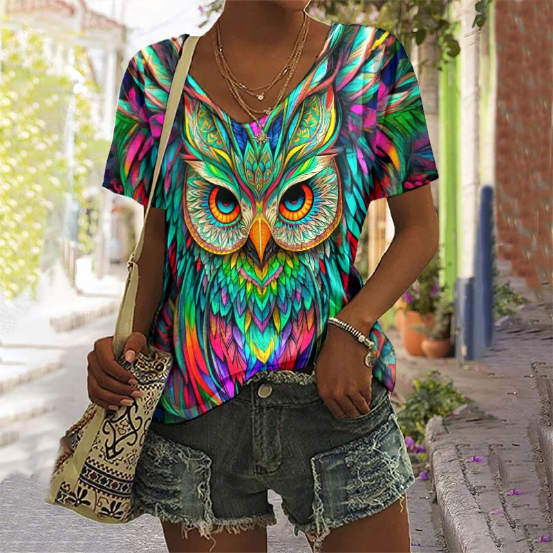 Women's Colorful Owl Art Printed Casual V-neck T-shirt