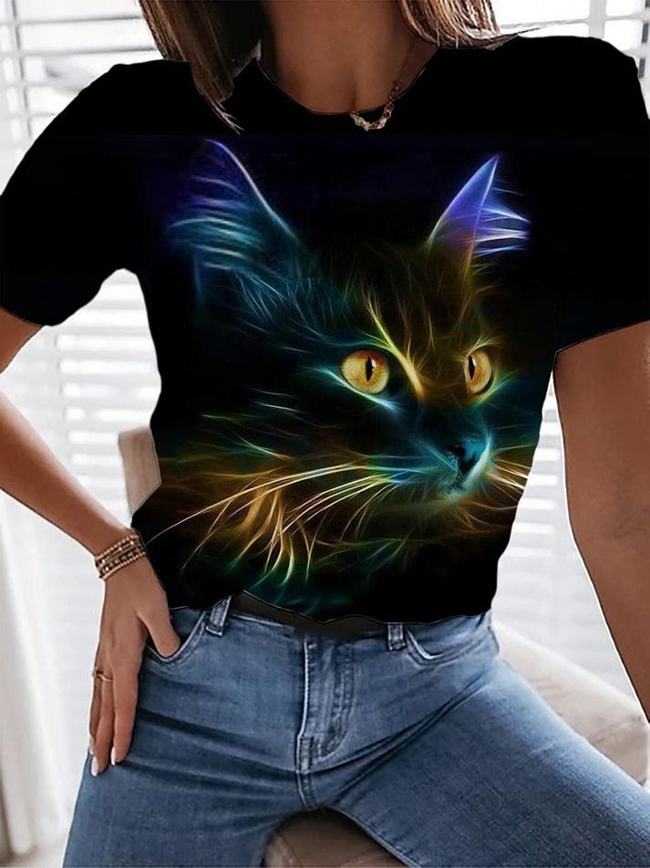 Women's Oil Painting Cat Print V-neck Long Sleeve T-shirt