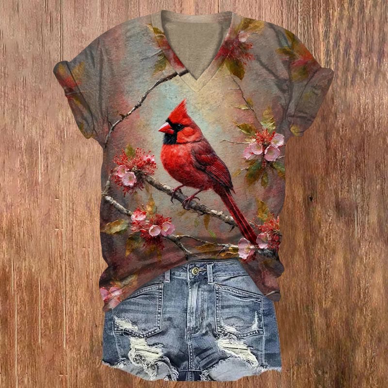 Spring Cardinal Print Short Sleeve V-neck T-shirt