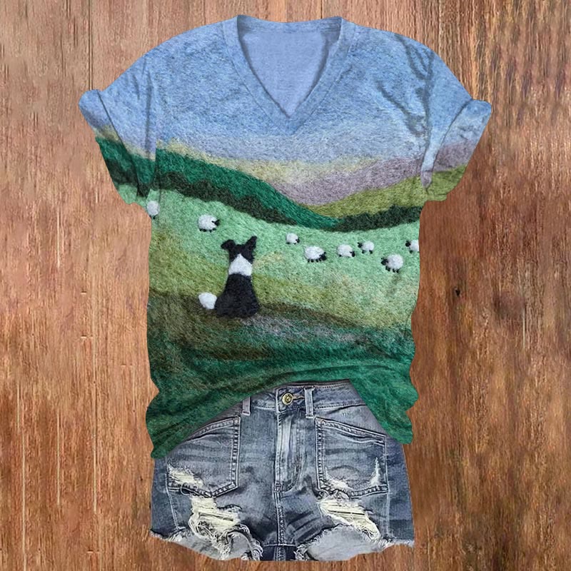 Cute Border Collie & Sheep Landscape Art Print Casual V-neck Short-sleeved T-shirt