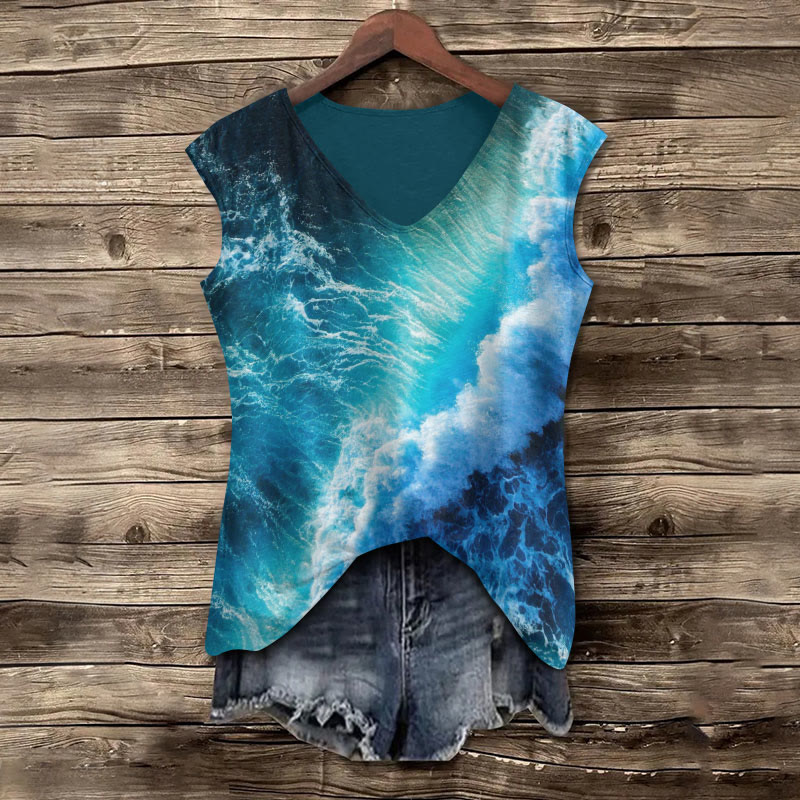 Women's Blue Wave Ombre Print V-neck Tank Top