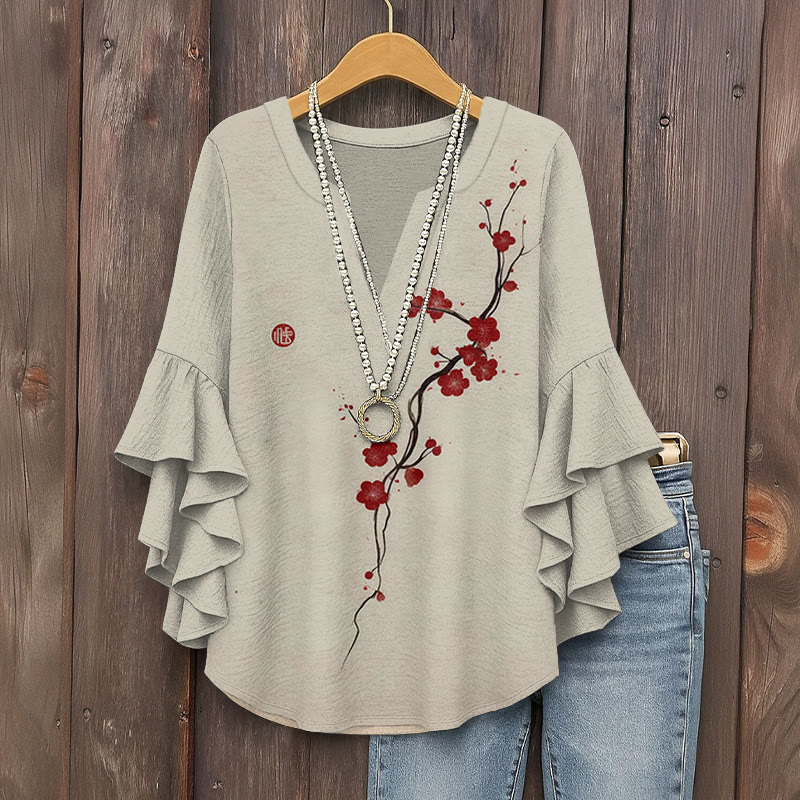 Vintage Gradient Plum Blossom Pattern Print V-neck Half Sleeve Blouse