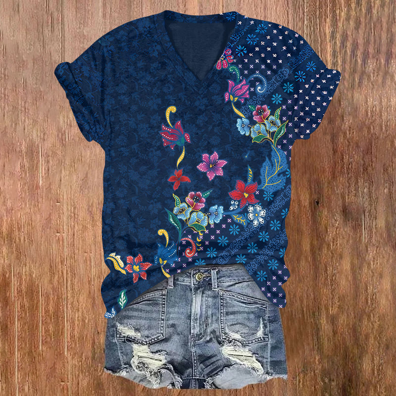 Vintage Colorful Floral Pattern Print Short Sleeved V-neck T-shirt