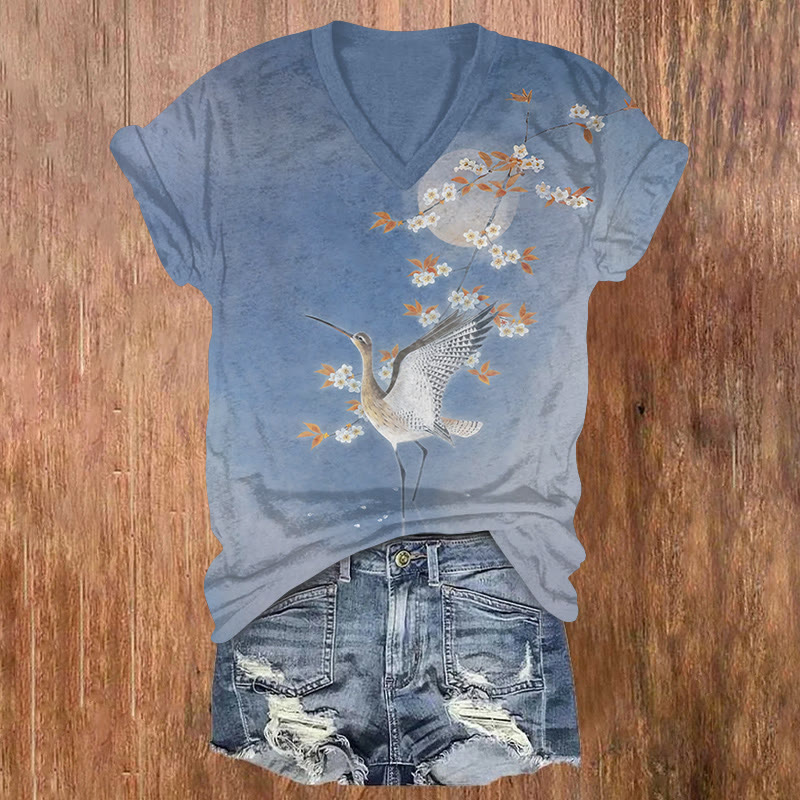 Vintage Asian Crane & Floral Art Print Short Sleeved V-neck T-shirt
