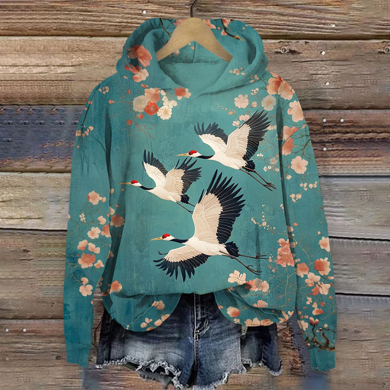 Japanese Retro Sakura & White Cranes Art Print Long Sleeve Hoodie