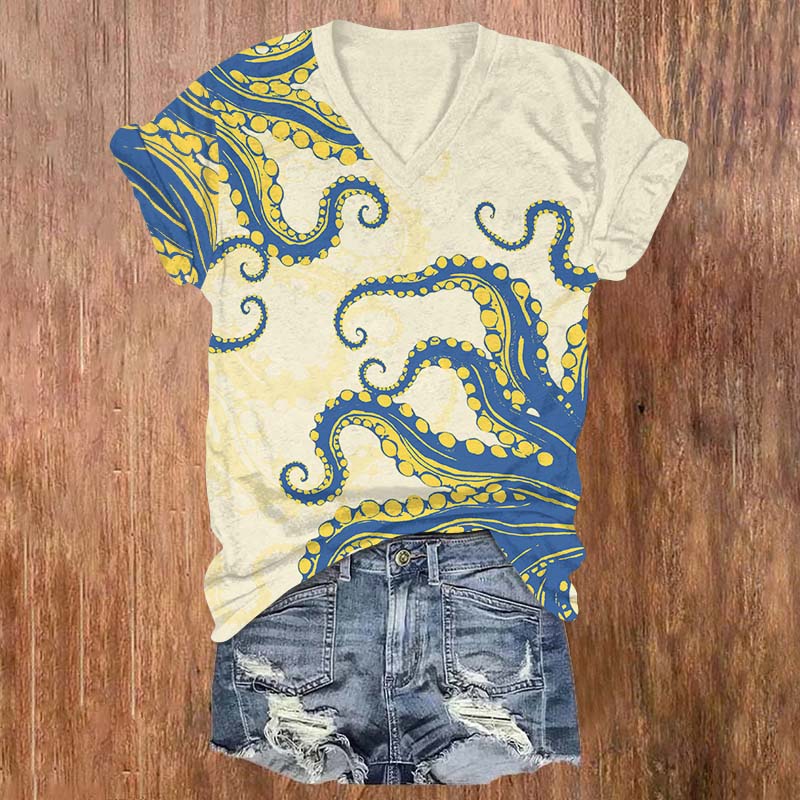 Vintage Contrasting Color Octopus Tentacles Print V-neck T-shirt