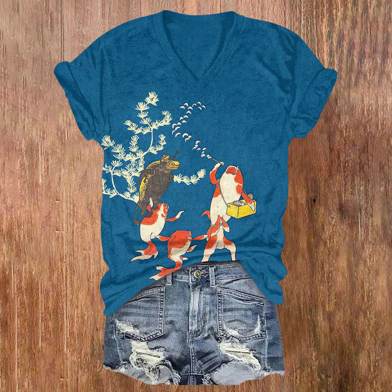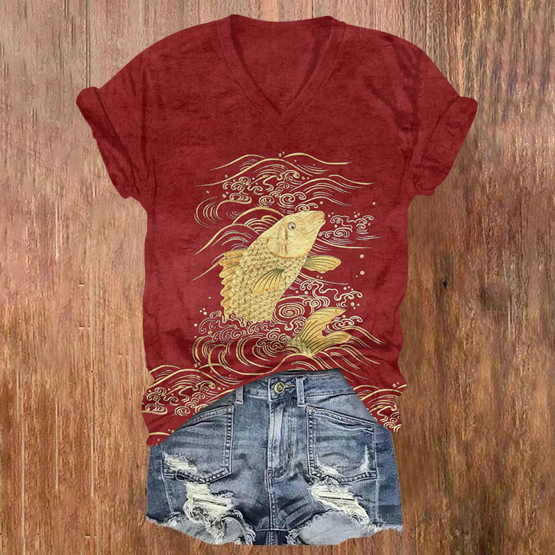 Japanese Gold Fish With Wave Print V-neck T-shirt