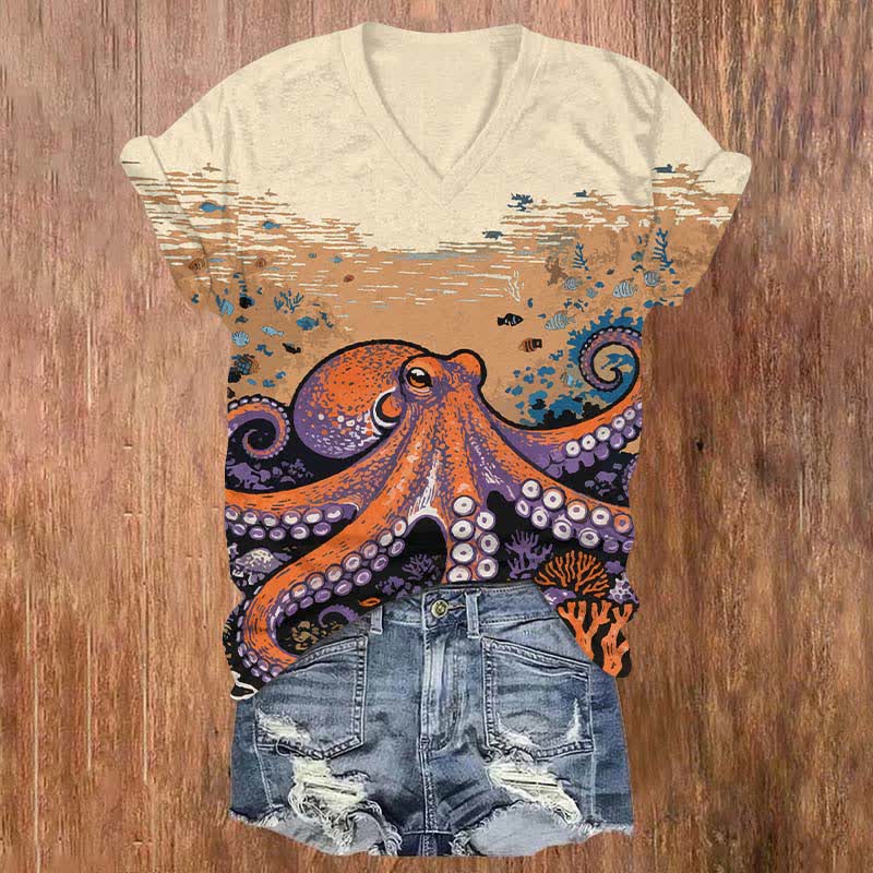 Ocean Octopus Print V-neck T-shirt