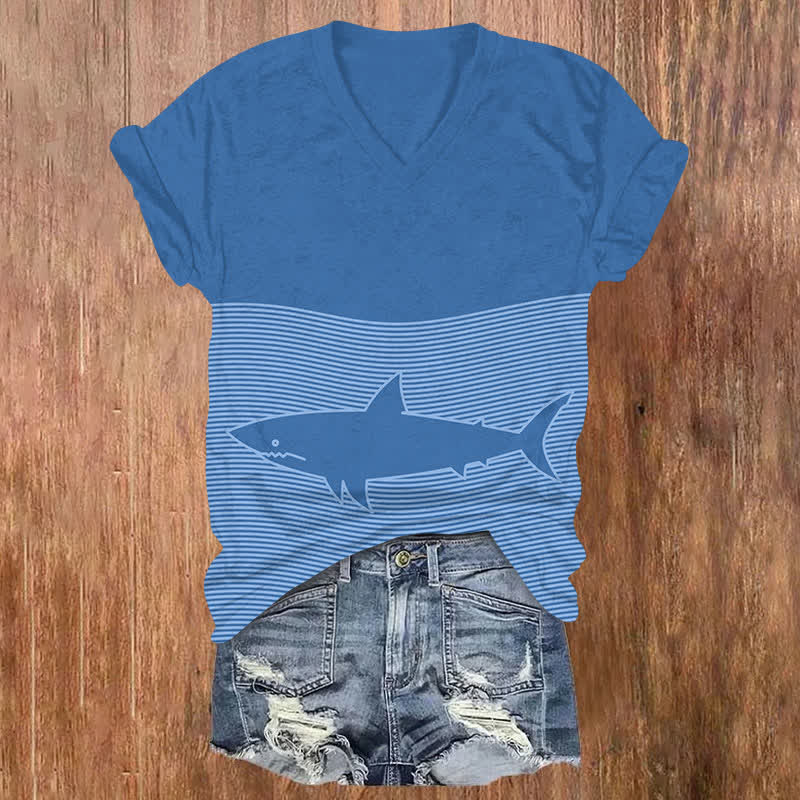 Shark Shadow Under The Sea Print V-neck T-shirt