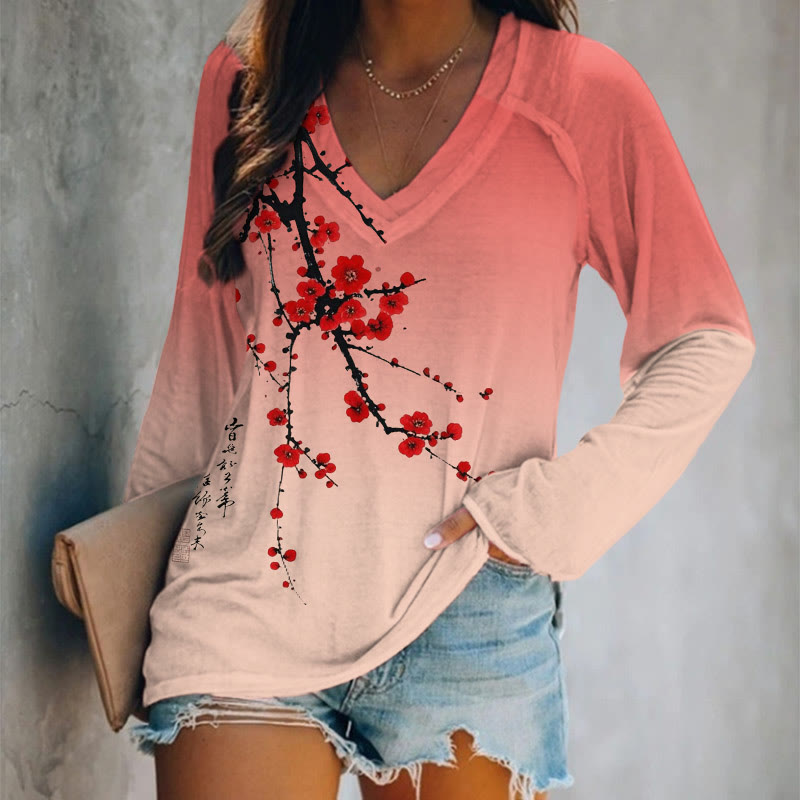 Japanese Plum Blossom Swallow Print V-neck T-shirt