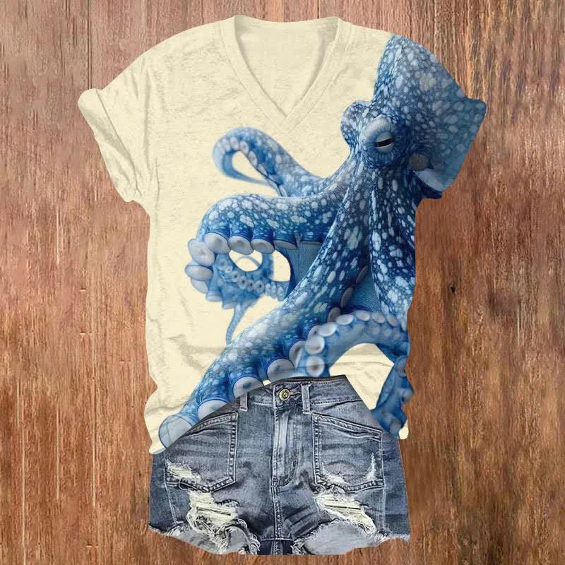 Unique Exquisite Octopus Pattern Print V-neck T-shirt