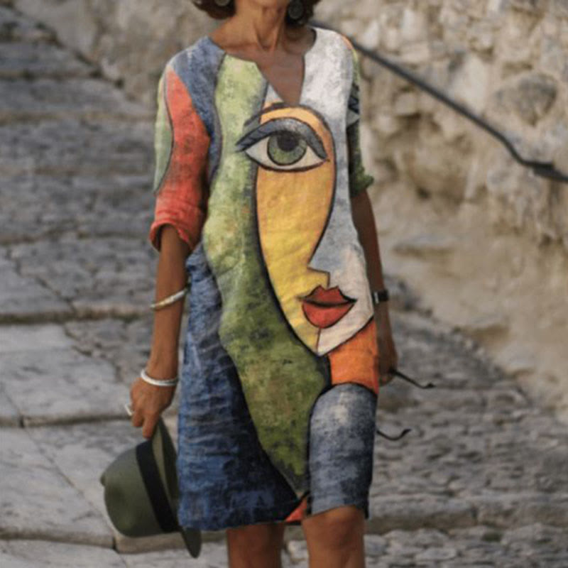 Women's Abstract Face Print Loose Casual V-Neck Dress