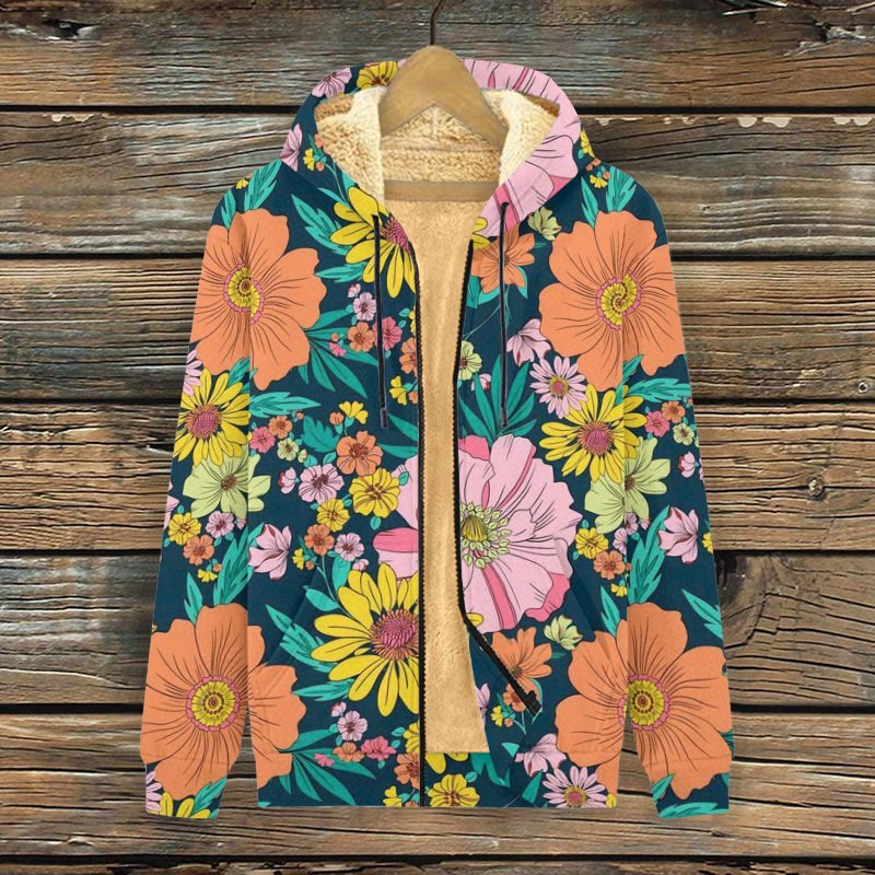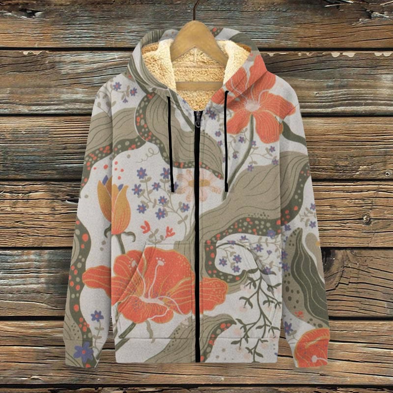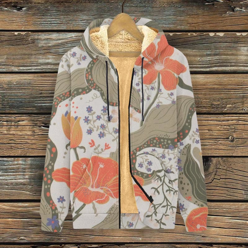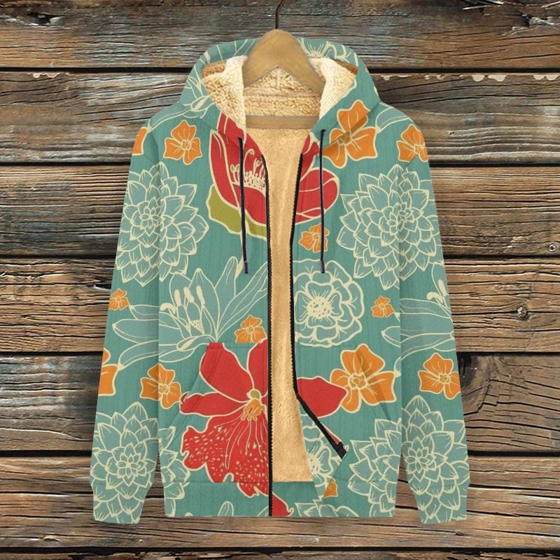 Retro Watercolor Sketching Floral Print Fleece Jacket Coat