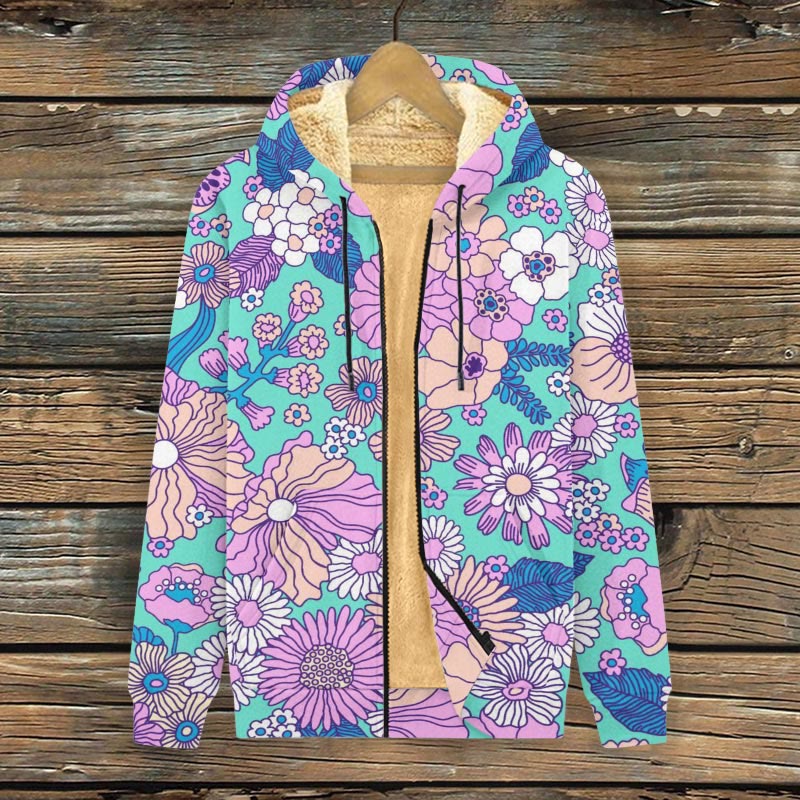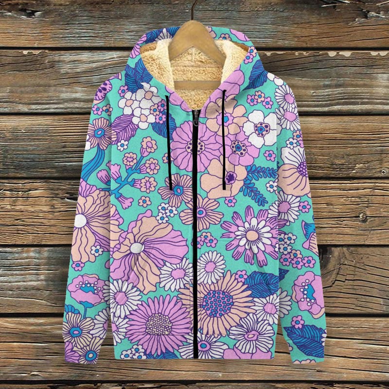 Retro Lovely Purple Floral Print Fleece Jacket Coat