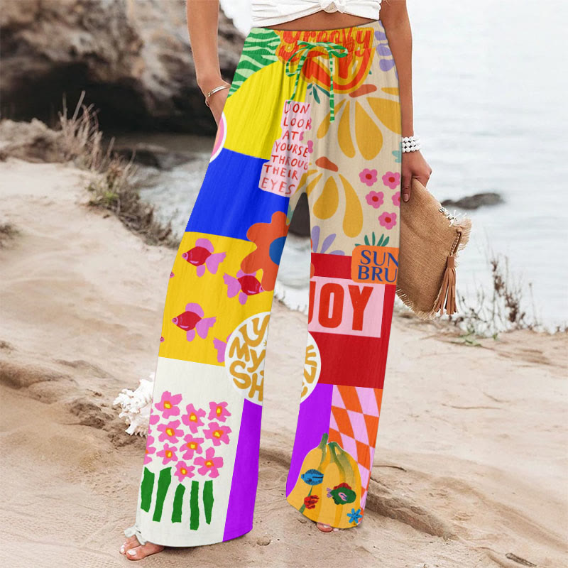 Women's Japanese Style Cute Sardines Art Print Wide-leg Casual Pants