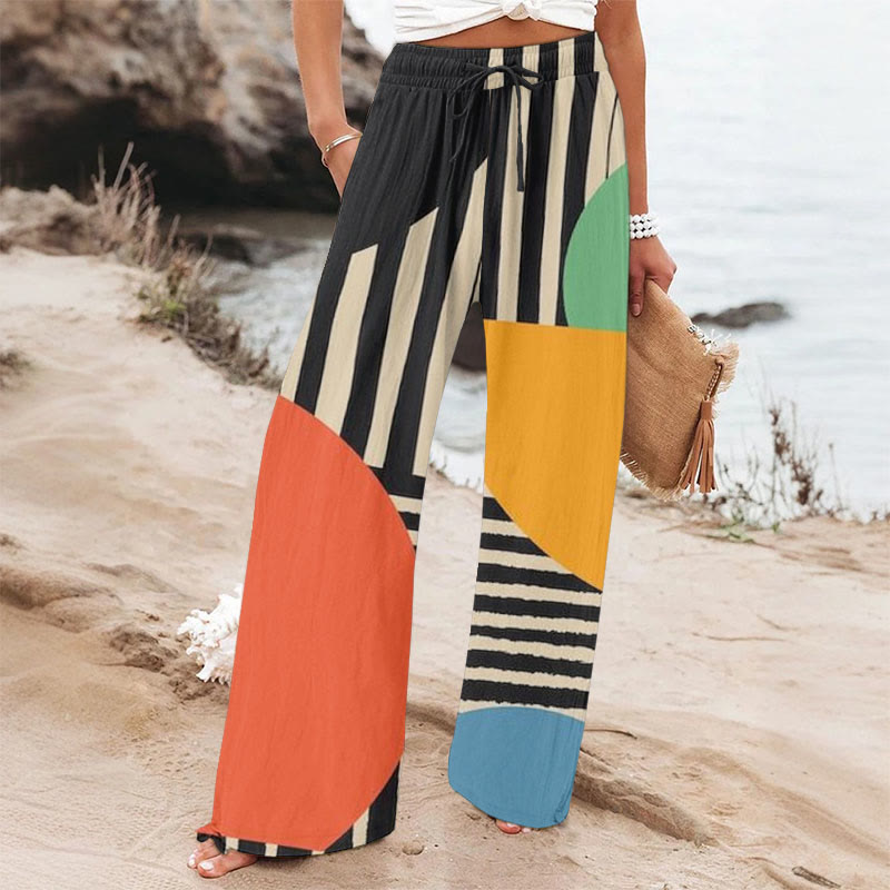 Women's Contrast Round & Striped Art Print Casual Pants