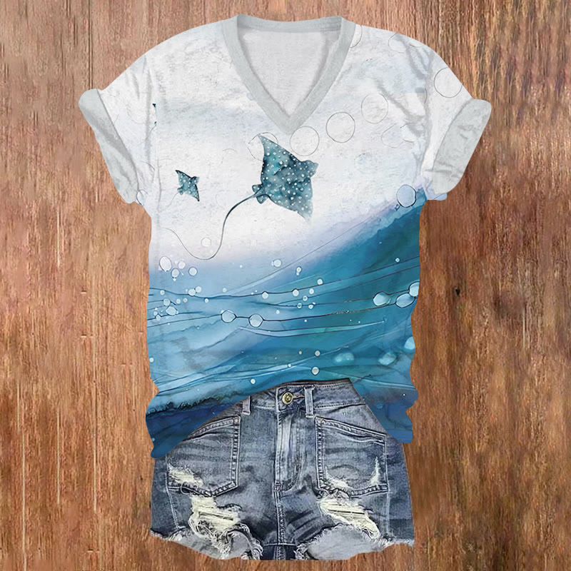Watercolor Ocean Ray Art Print V-neck T-shirt