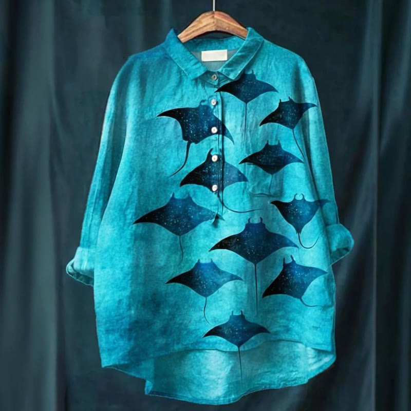 Women's Vintage Manta Rays Art Print Casual Cotton Shirt