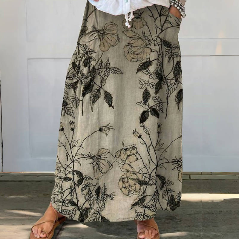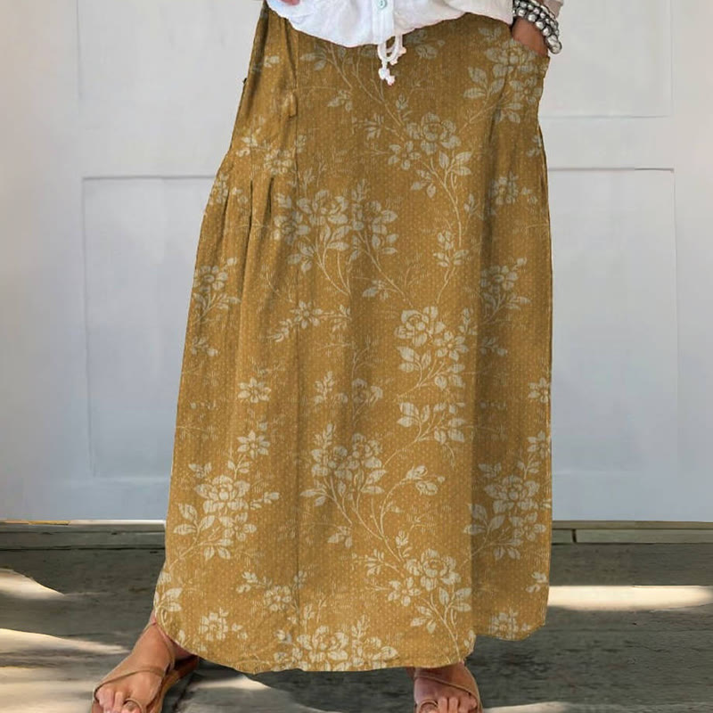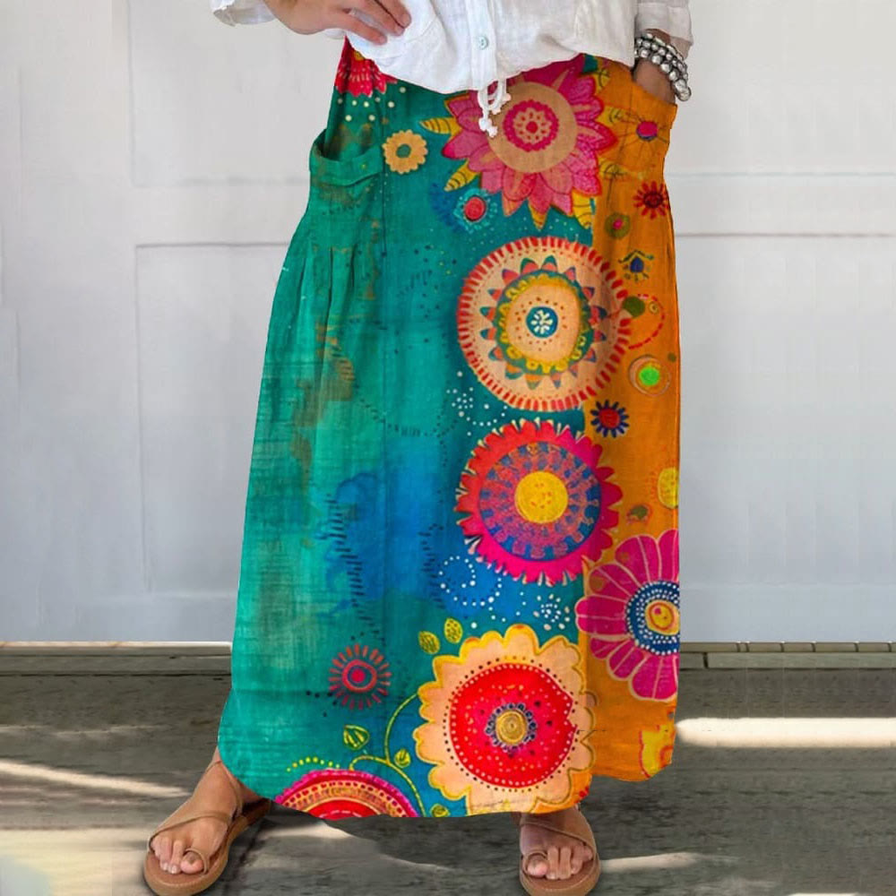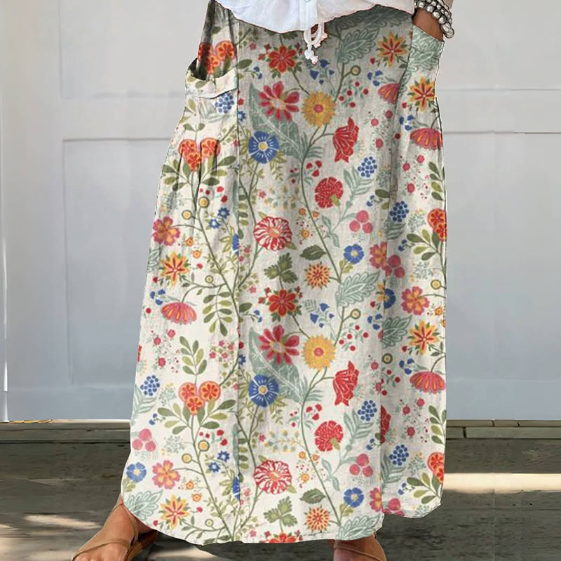 Women's Retro Floral Art Linen Elastic Waistband Pocket Skirt