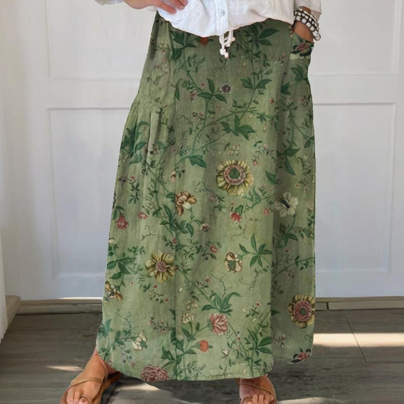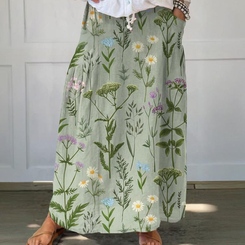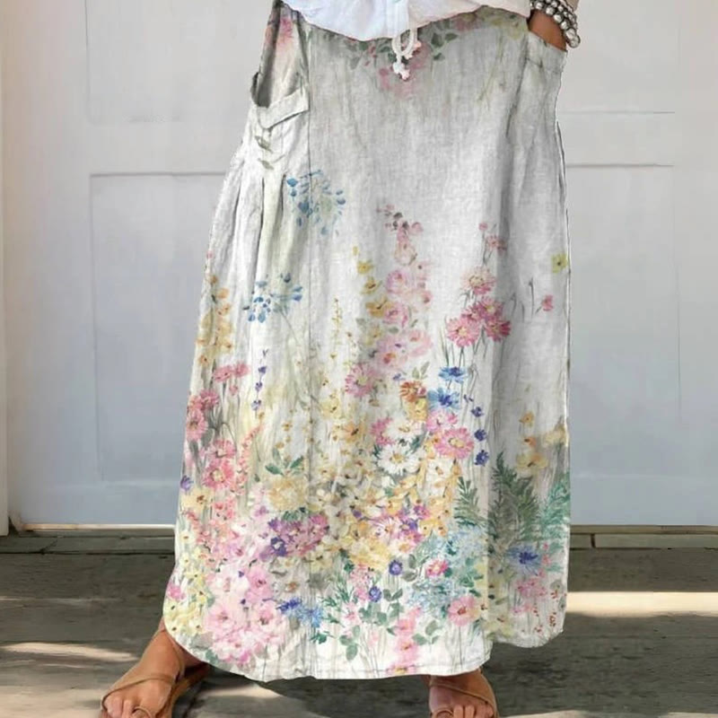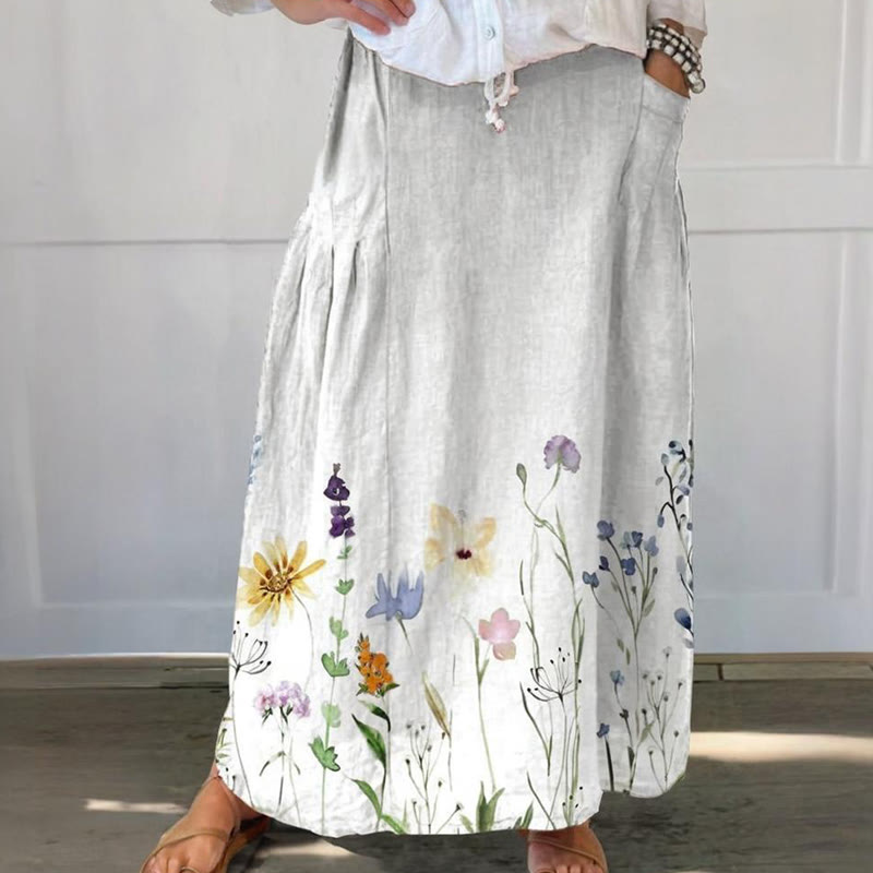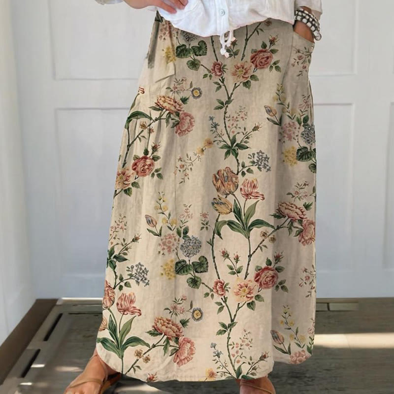 Women's Vintage Botanical Floral Linen Elastic Waistband Pocket Skirt