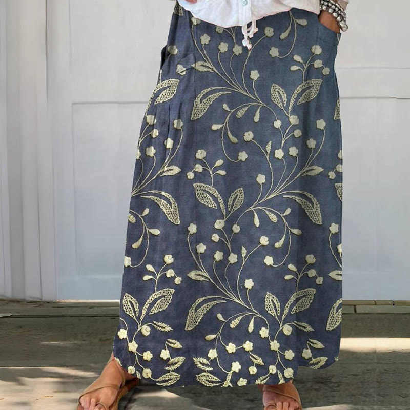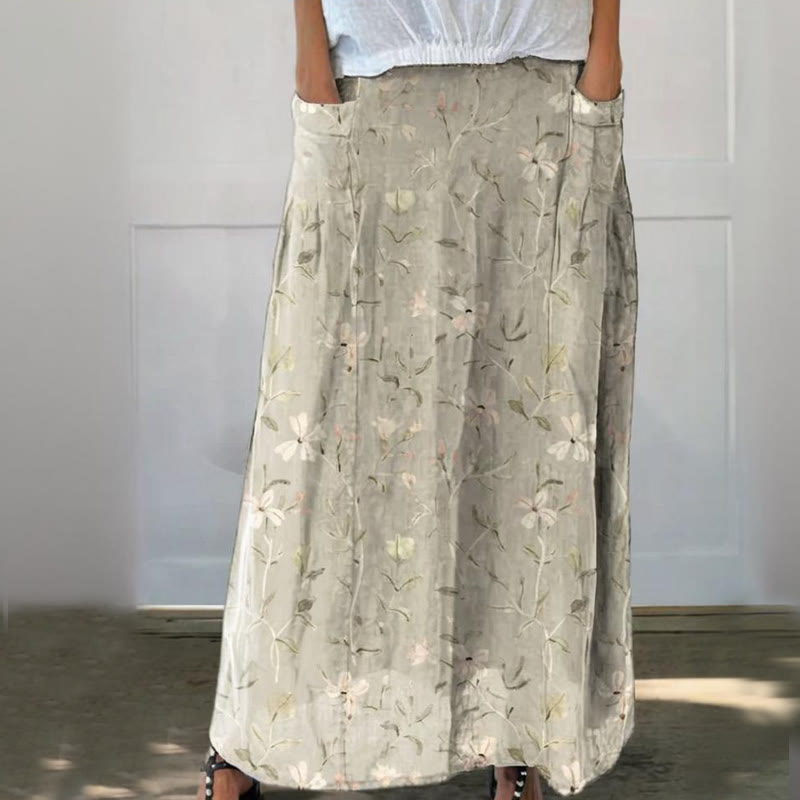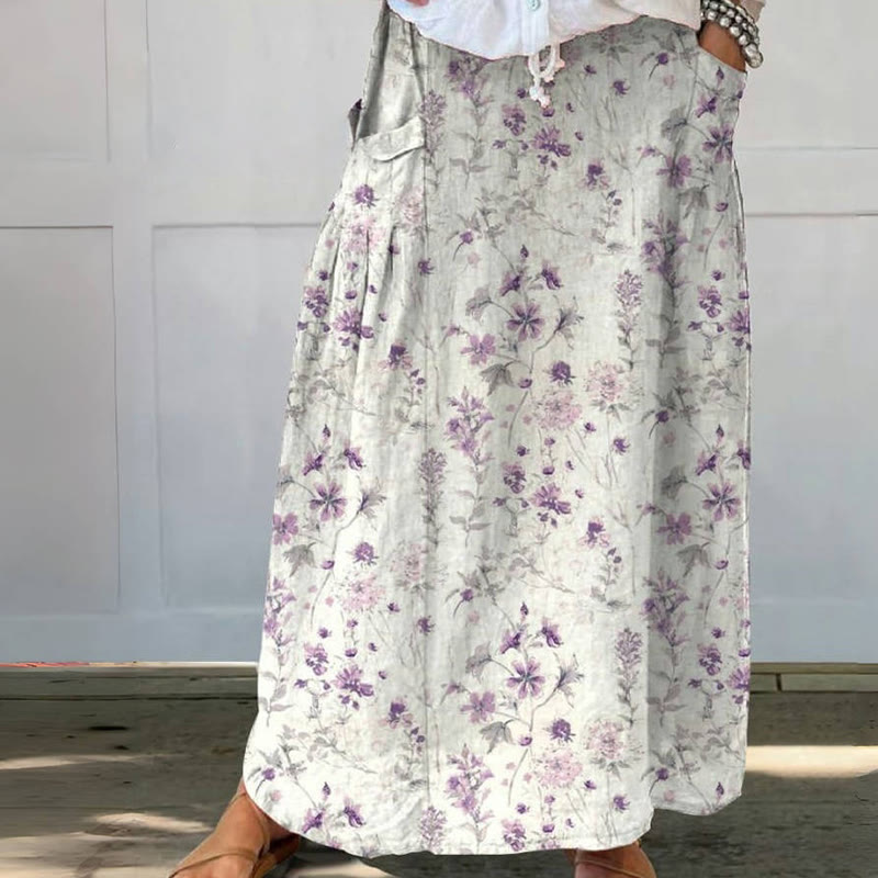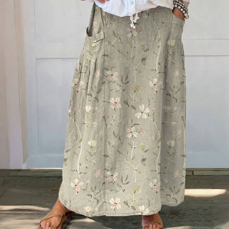 Women's Vintage Floral Linen Elastic Waistband Pocket Skirt