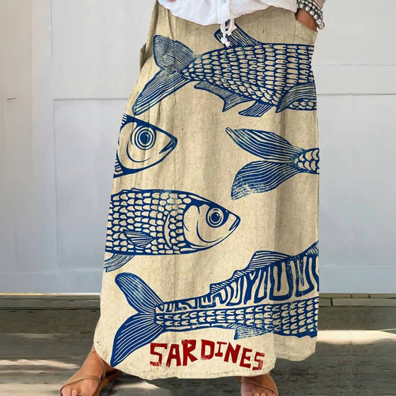 Women's Vintage Fish Sardine Art Print Linen Pocket Skirt