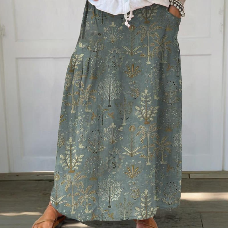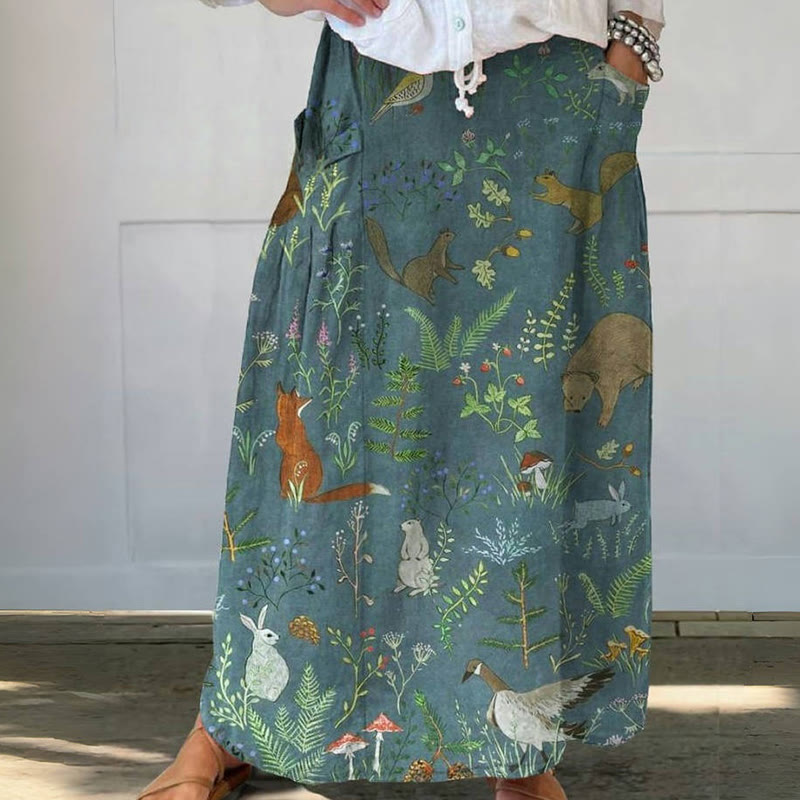 Woodland Vegetation Pattern Printed Women's Linen Elastic Waistband Pocket Skirt