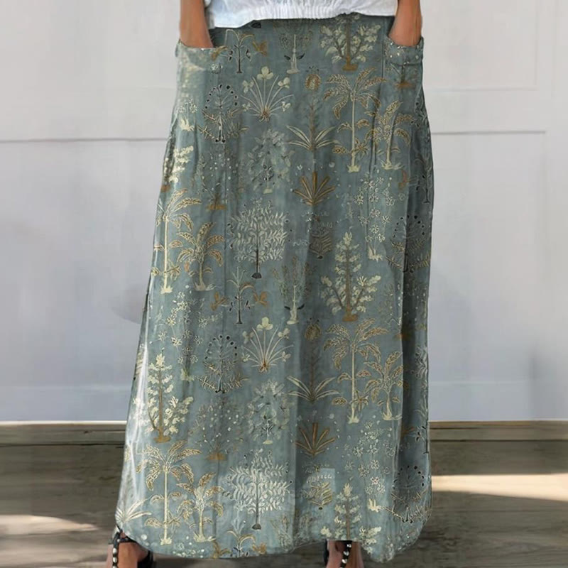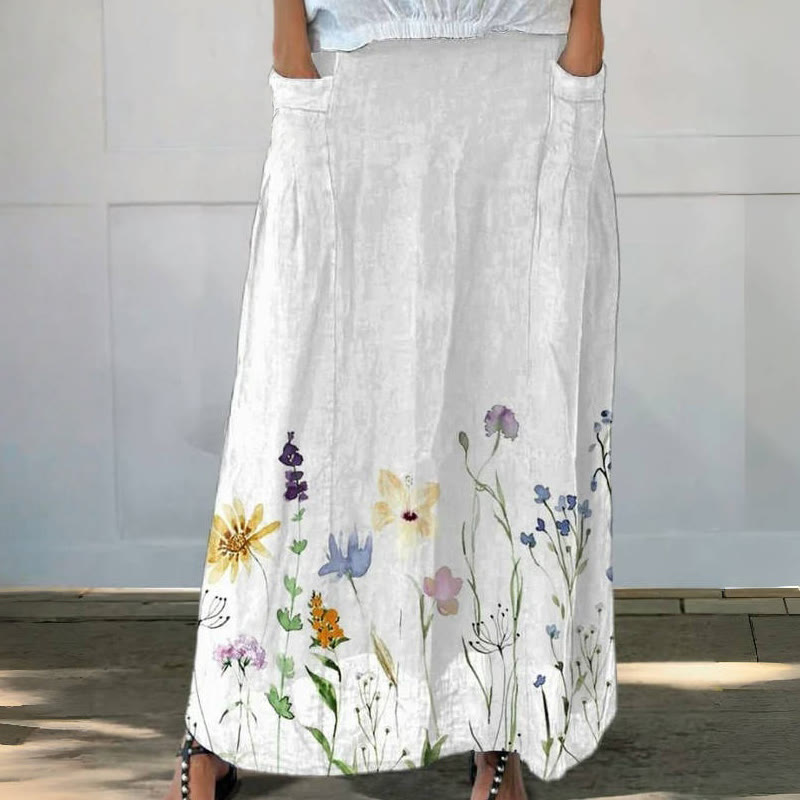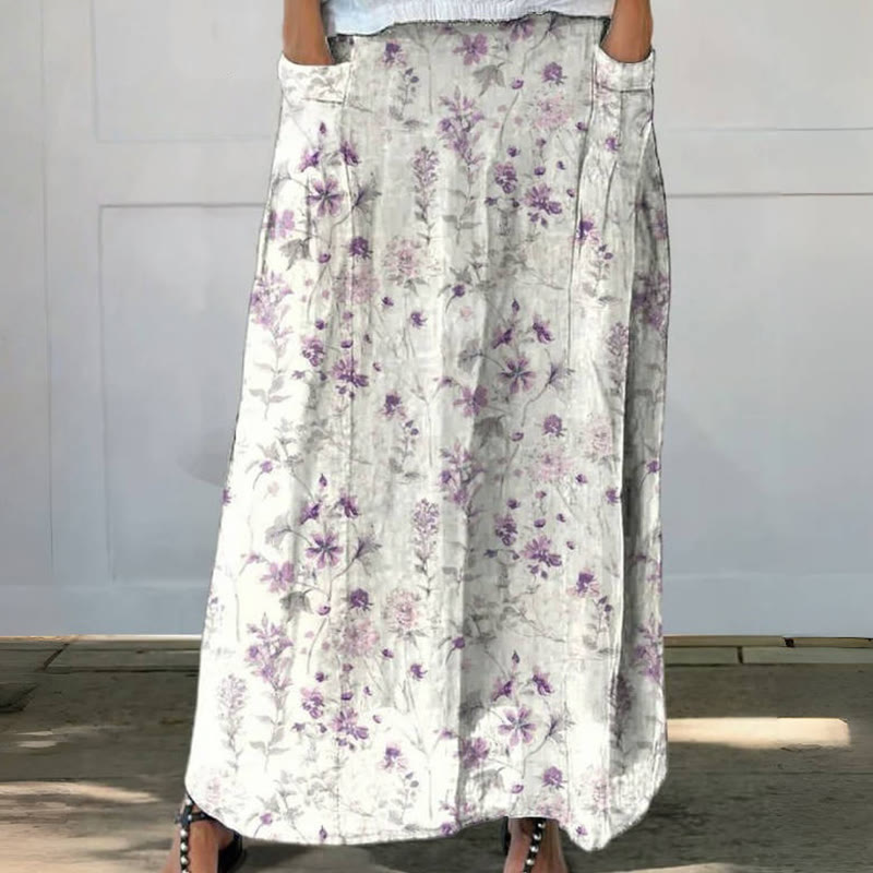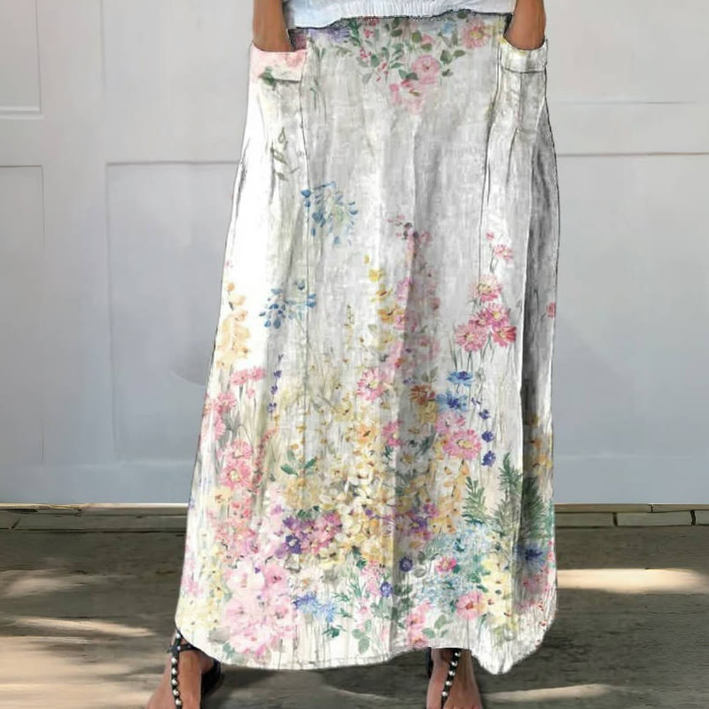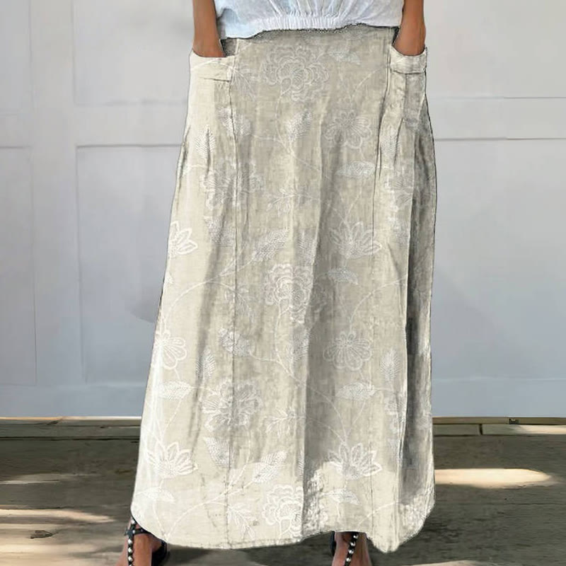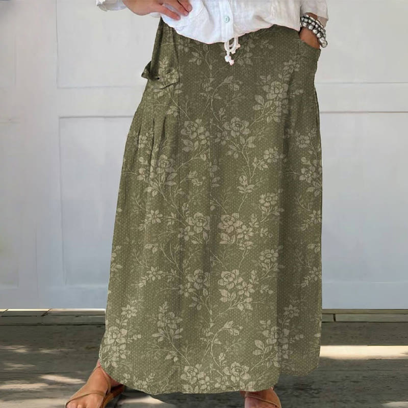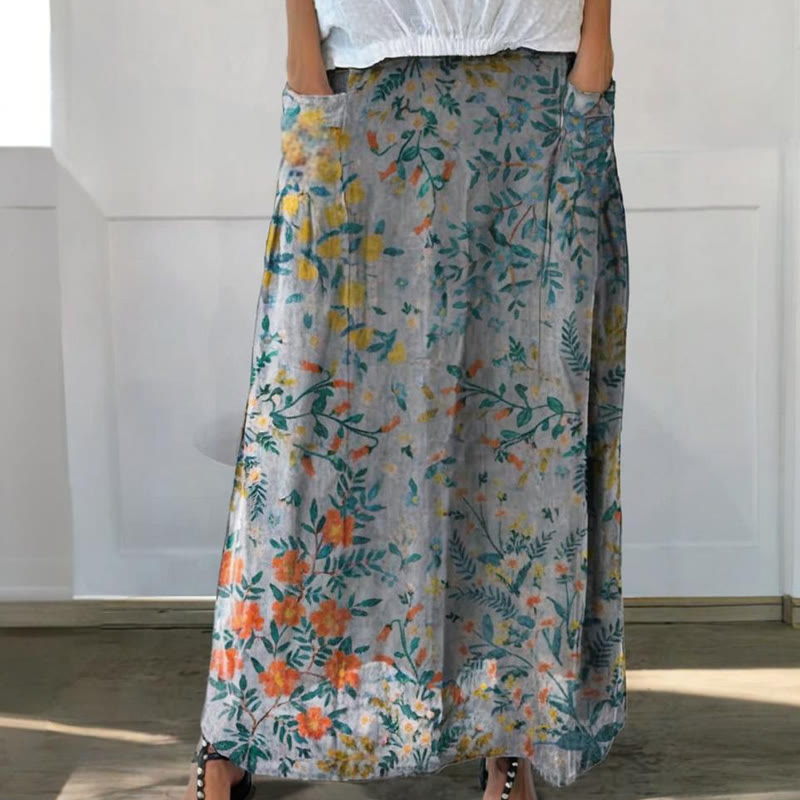 Women's Retro Elegant Floral Art Pattern Print Linen Pocket Skirt