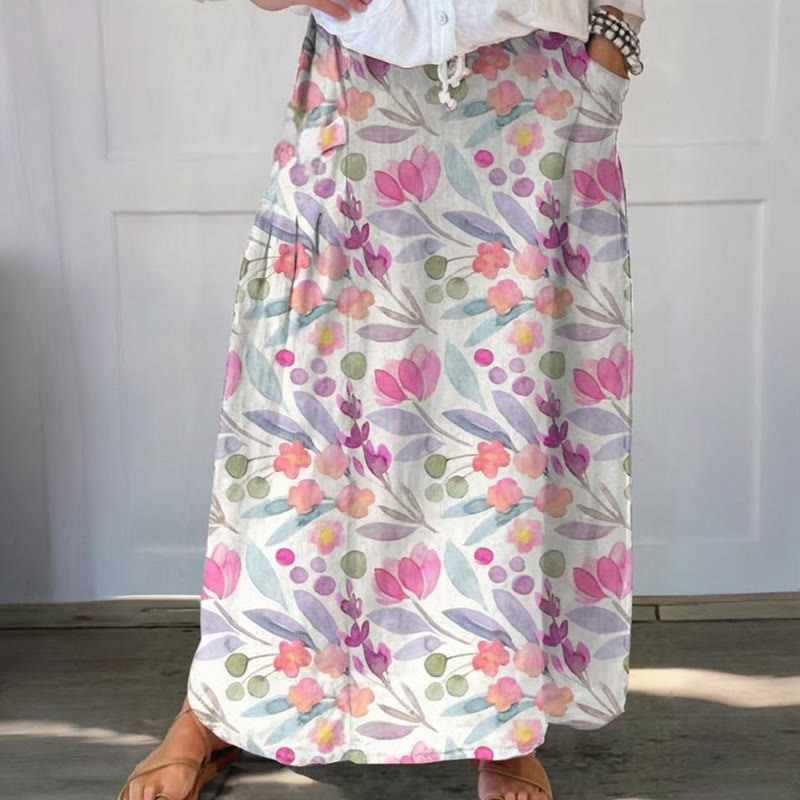 Watercolor Spring Meadows Art Printed Women's Linen Elastic Waistband Pocket Skirt