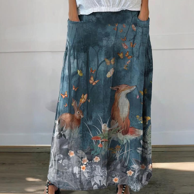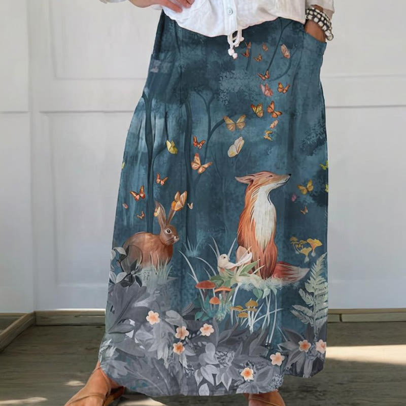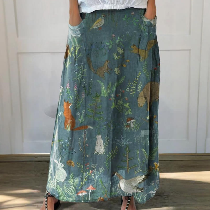 Women's Retro Floral Animals Art Casual Linen Pocket Skirt