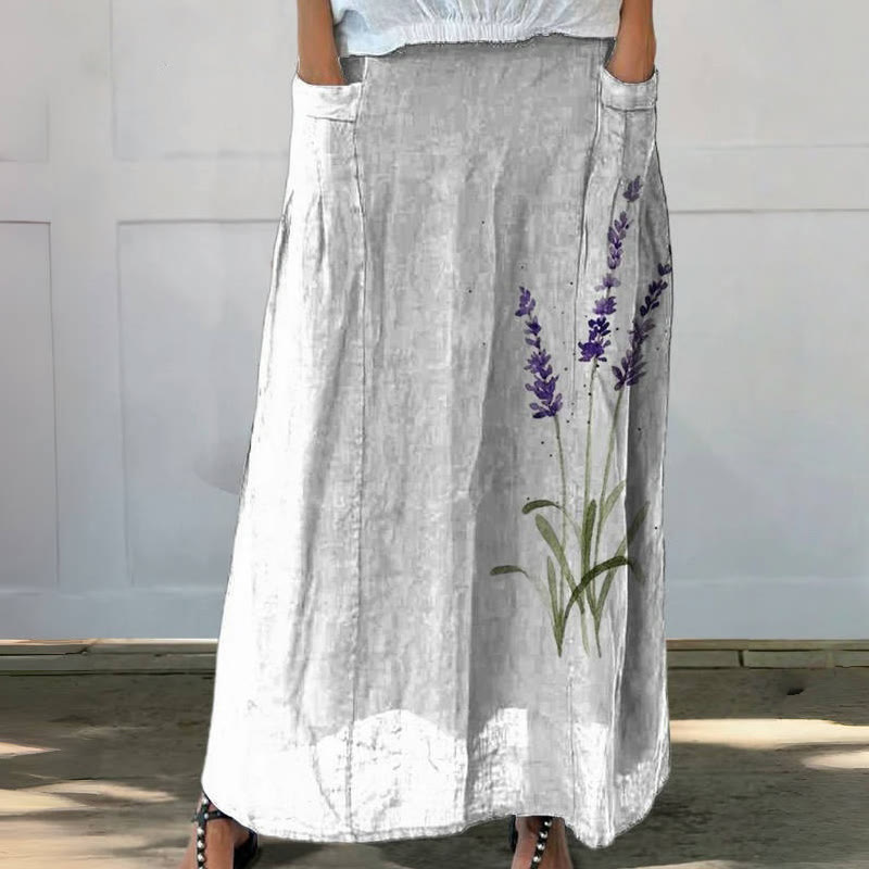 Watercolor Lavender Floral Printed Women's Linen Elastic Waistband Pocket Skirt
